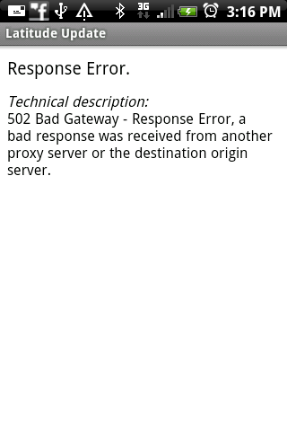 On the other hand, if you get the following, it means that Google Latitude login service is blocked by your service provider. You can still use Latitude Update when you are connected through WIFI, but not on the provider data network. The only provider we have found to do this so far are AT&T: