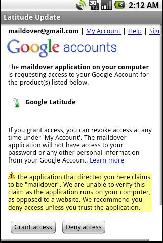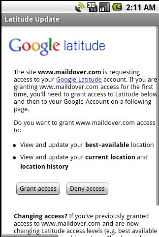 Now you should see the following screen - note that you may get this screen before the previous if you already entered your username/password a short while ago. Also note that the permission request will mention www.maildover.com - that's the developer that created Latitude Update application. Please click "grant access":