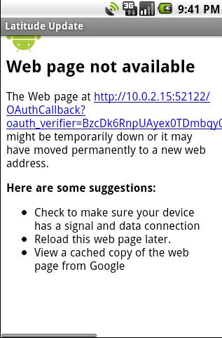 Note that you might be getting the following error page in stread, it usually means that Google Latitude login service did complete successfuly, just click "back" and continue: