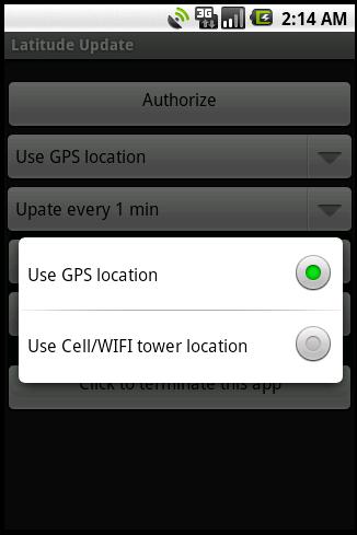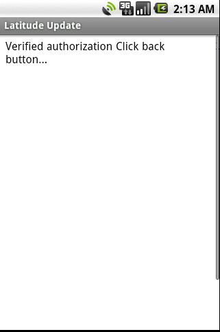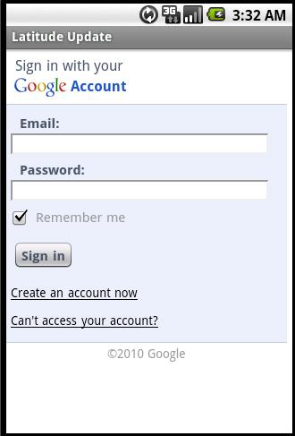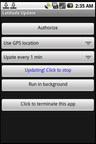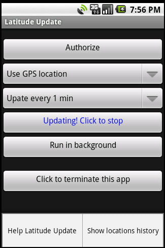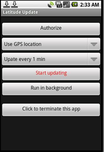 NOTE 2: For MetroPCS users, it seems that this provider also blocks the Google Latitude login service - but apparently you can still authorize while on WIFI. So here is what you can do - start the app and click authorize, ener username/password etc (see below), aftre that click "back", and click "start updating" - it will probably work fine even when you leave the WIFI area. We are trying to figure out the issue with the provider.