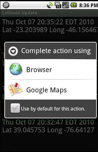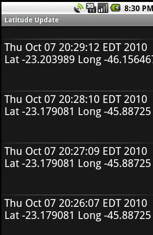 Note that the update will occur every minute now, as this is the default setting. So even if the GPS provider will update your device less frequently than 1 minute, e.g. every half hour, Latitude Update will update the location for half hour with exactly same location - the latest one received from the GPS provider. Also, note that Latitude Update overlays the native Google Latitude updates - in other words, if Goolge Latitude application is running on your Android at the same time as Latitude Update, both Google Latitude and Latitude Update will update the location history concurrently.